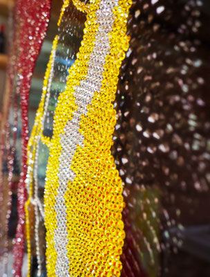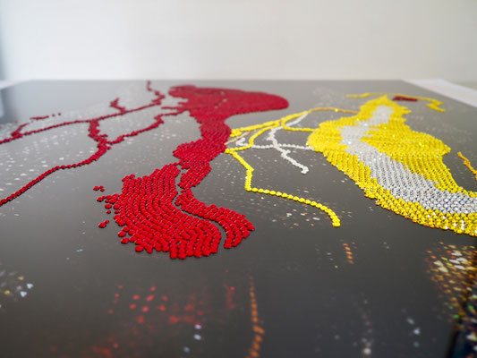The delicate surfaces, interwoven with the finest threads in red, yellow, black, and chrome, give this work a breathtaking radiance.